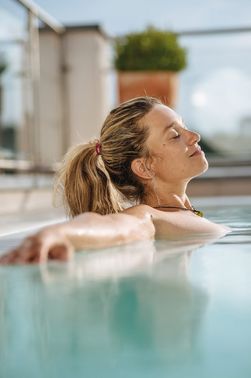 Dans la piscine panoramique thermale à 36 °C et dans la piscine d'eau salée à 29 °C, les clients peuvent directement expérimenter la puissance bienfaisante de l'eau. La baignade favorise la circulation sanguine, détend les muscles et soutient la récupération de manière naturelle.